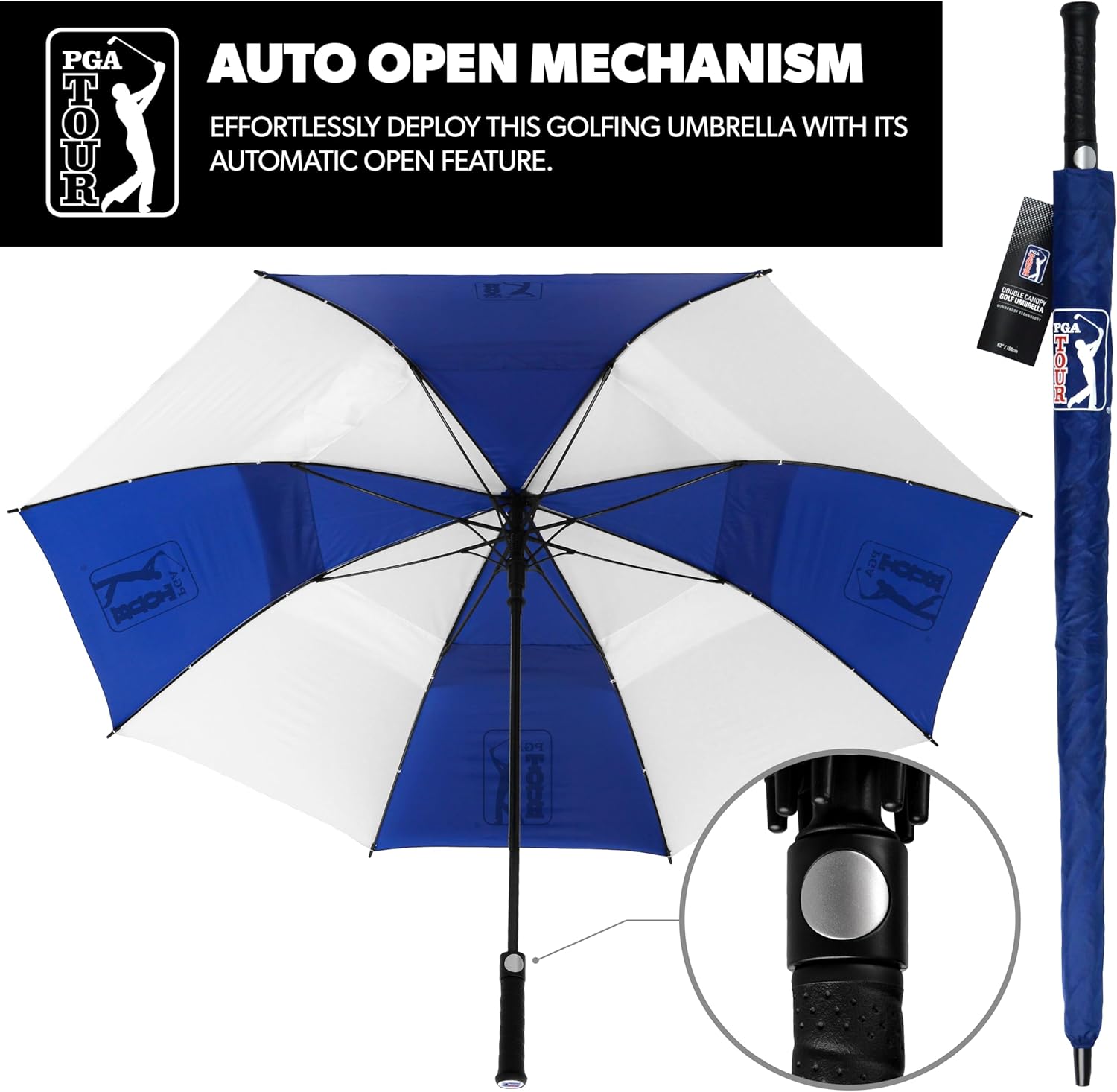 Introducing the PGA TOUR 62-Inch Golf Umbrella, designed for durability and convenience on the green. This men's umbrella features advanced windproof double canopy technology, ensuring you stay stable and dry even in challenging weather conditions.